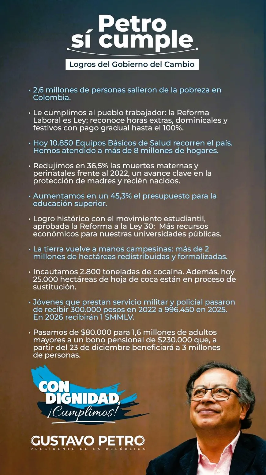 A continuación, algunos de los logros obtenidos durante los tres años y medio del Gobierno del presidente Gustavo Petro. Resultados que hoy se reflejan en la vida de millares de colombianos.