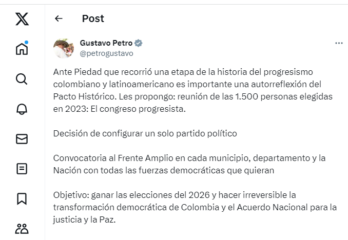 “Acogemos la idea del presidente Petro de avanzar hacia un partido unitario pero con la forma de un Frente Amplio como en el Uruguay. La identidad de los actuales partidos no debe desaparecer sino unificarse en torno a un ideario común que va mucho más allá de la izquierda”, precisó la congresista del Pacto Histórico.