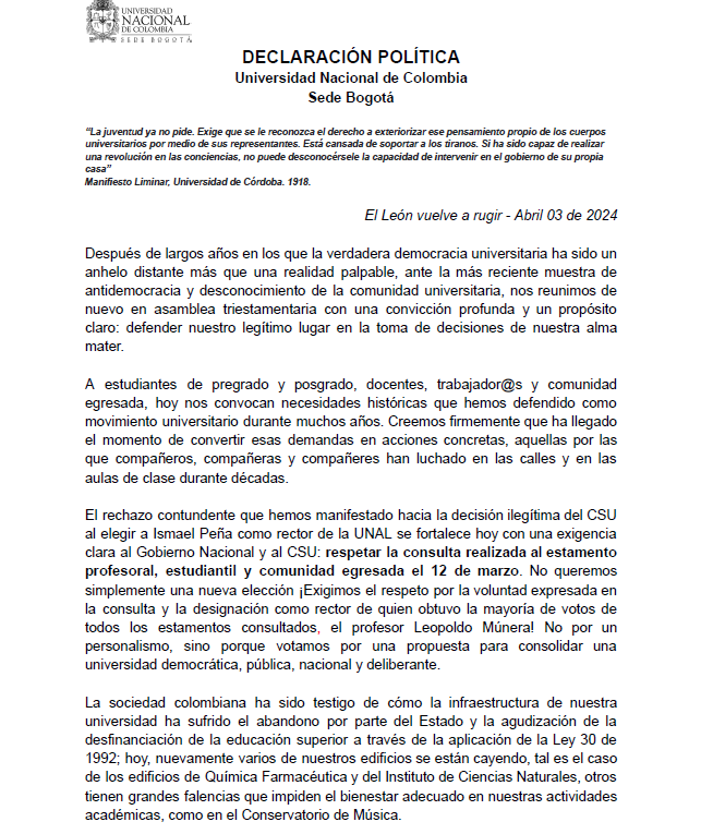 Mediante un comunicado público la Asamblea Triestamentaria de la Universidad Nacional de Colombia, sede Bogotá, definió entrar en paro indefinido como consecuencia del desconocimiento del proceso democrático interno en la escogencia del nuevo rector de la institución.
