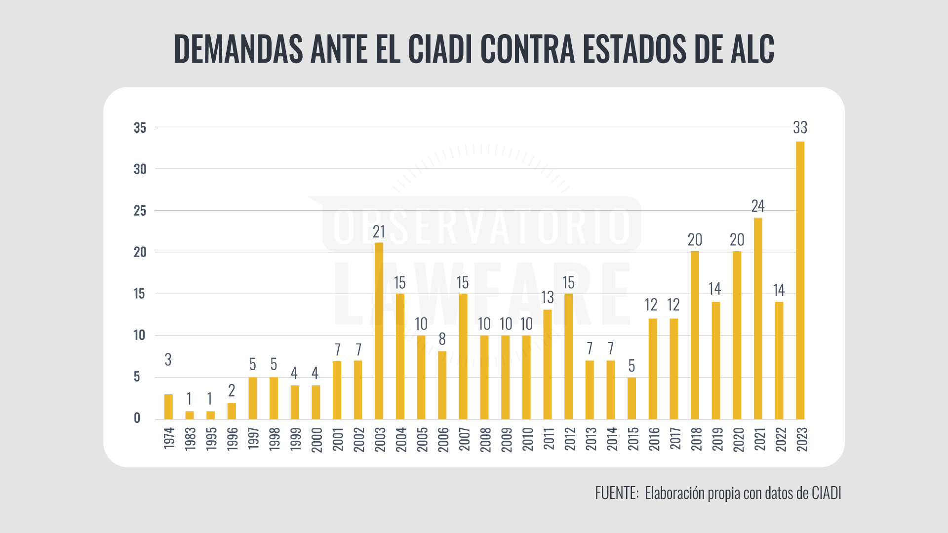 Según datos del CIADI, desde 1974 hasta 2023 existen 334 demandas contra los Estados en América Latina. Los cinco Estados más demandados son: Argentina (59), Venezuela (55), México (46), Perú (43) y Colombia (20). Estos países concentran el 67% de las demandas totales.