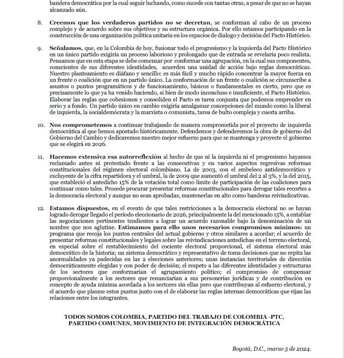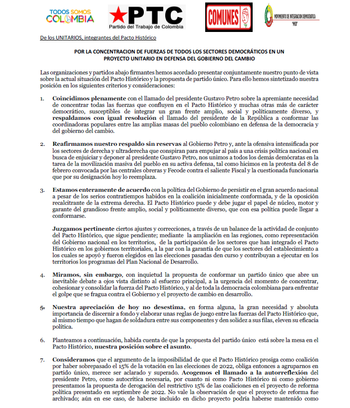 Ante la exhortación reciente del presidente Gustavo Petro a la coalición del Pacto Histórico de hacer un autorreflexión con el propósito de concretar un partido único del progresismo y las izquierdas en Colombia con miras a las elecciones de 2026, el Partido Somos Colombia (TSC), Comunes, el Partido del Trabajo de Colombia (PTC) y el Movimiento de Integración Democrática (MID), a través de un pronunciamiento público sentaron su posición al respecto.