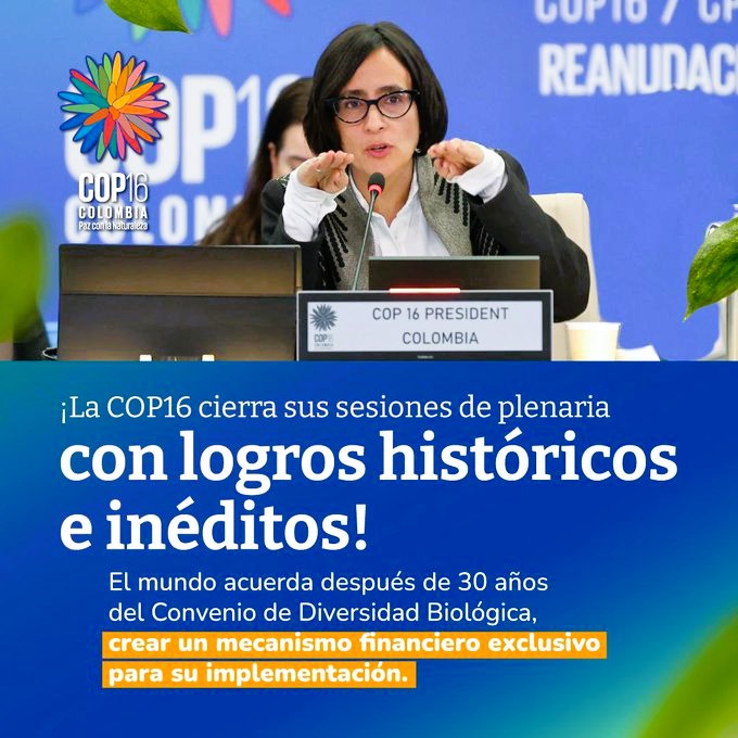 Un reconocimiento al liderazgo de Colombia por los logros sin precedentes alcanzados en esta Cumbre ambiental de Naciones Unidas. Tras 30 años de debates y análisis la biodiversidad tendrá un fondo propio, clave decisión en la COP16, el cual movilizará recursos para desarrollar estrategias claras que permitan su cuidado y conservación.