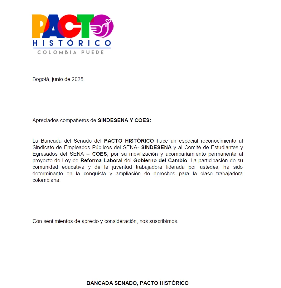 A través de una misiva la bancada del Pacto Histórico en el Senado de la República expresó su reconocimiento tanto al Sindicato de Trabajadores del Sena (Sindesena) como al Comité de Estudiantes y Egresados de esta institución (COES) por la movilización y decidido acompañamiento durante el trámite en el Congreso de la reforma laboral.
