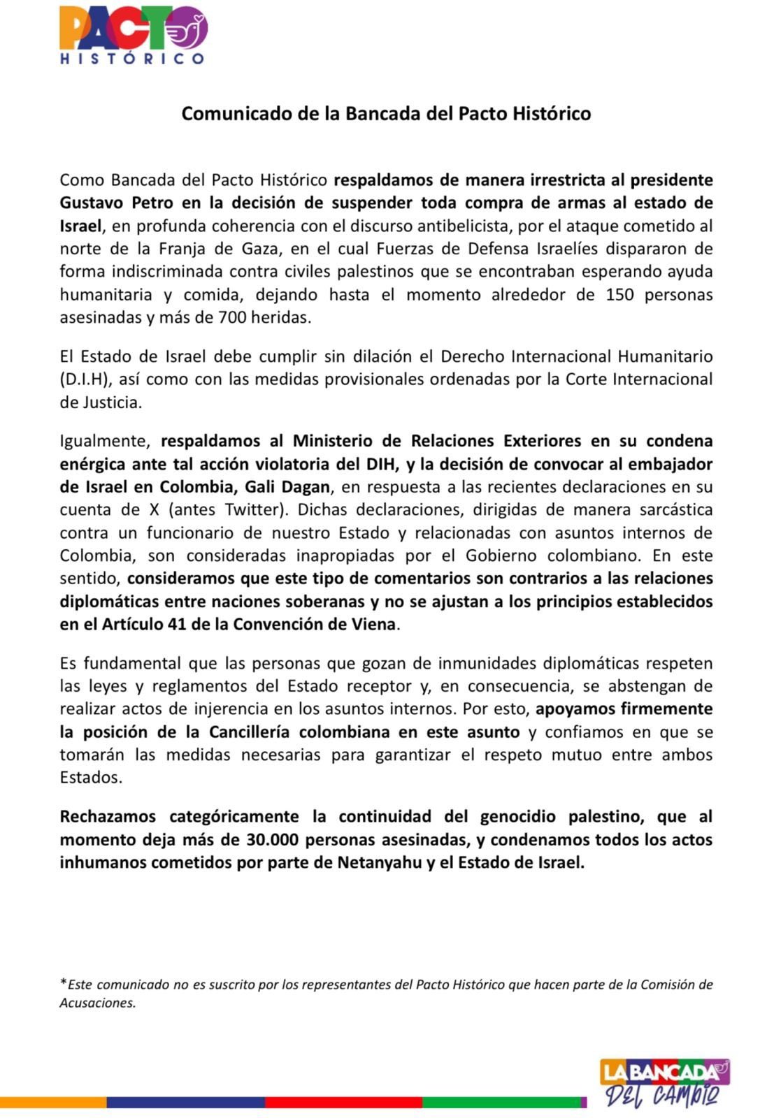 La bancada parlamentaria del Pacto Histórico emitió un pronunciamiento público en virtud del cual manifiesta su respaldo irrestricto a la decisión del presidente Gustavo Petro en el sentido de suspender toda compra de material bélico al Estado de Israel, al tiempo que reitera su solidaridad con el pueblo de Palestina, víctima de una operación de genocidio por parte del gobierno sionista que lidera el primer ministro Benjamin Netanyahu.