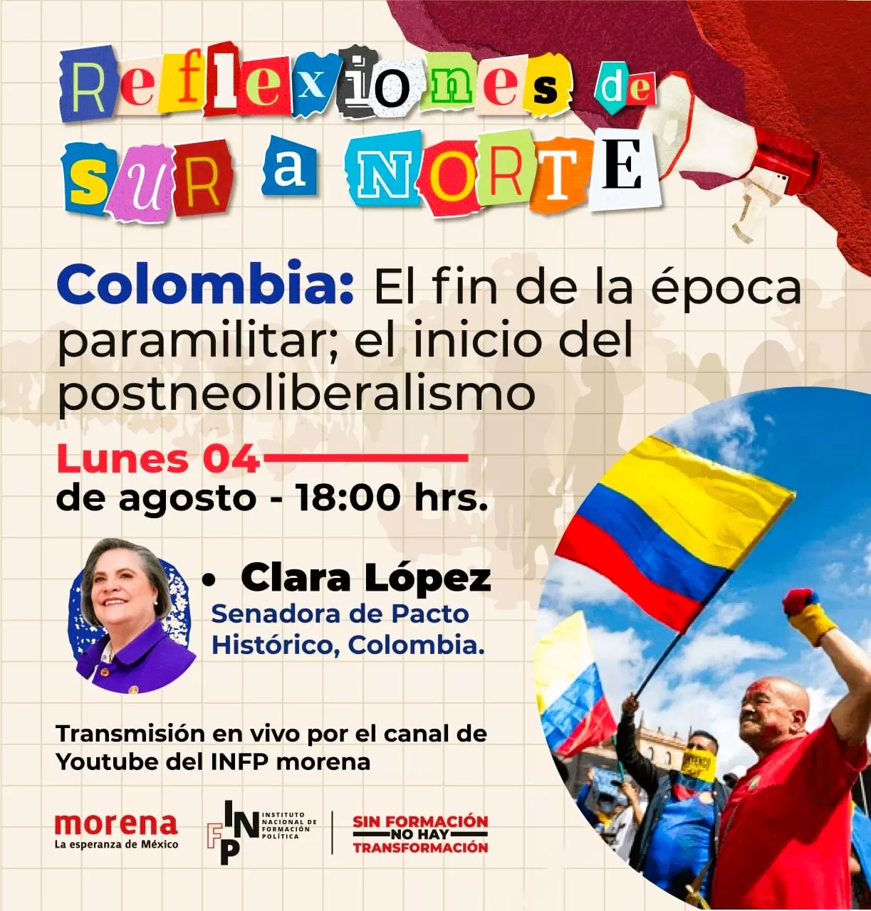 El pasado lunes 4 de agosto de 2025, en la Ciudad de México, el espacio “Reflexiones de Sur a Norte”, del Instituto Nacional de Formación Política (INFP) del partido mexicano Morena, tuvo como invitada especial a la senadora colombiana Clara López Obregón. A partir del tema “Colombia: el fin de la época paramilitar; el inicio del posneoliberalismo”, la conversación ofreció una mirada profunda y reflexiva sobre los cambios políticos, sociales y económicos en esta nación suramericana y su relación con los debates latinoamericanos contemporáneos.