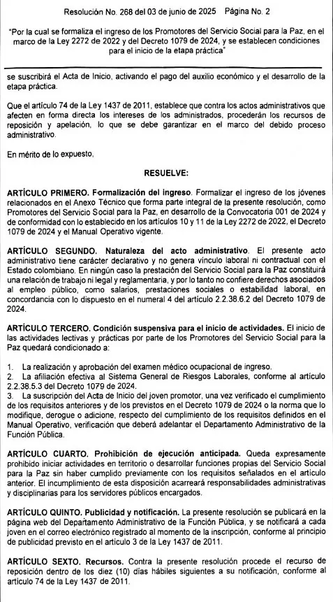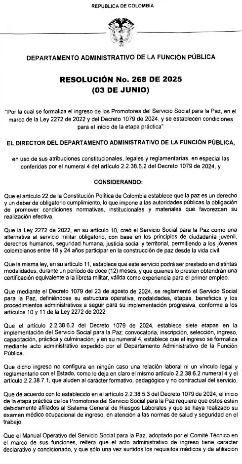 En los considerandos, la resolución establece que mediante el Decreto 1079 del 23 de agosto de 2024, se reglamentó el Servicio Social para Paz, definiendo su estructura operativa, modalidades, etapas, beneficios y los administrativos a seguir para implementación progresiva.