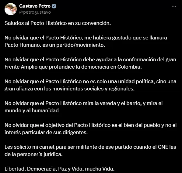 El presidente Petro hizo llegar un caluroso saludo a la Convención Nacional del Pacto Histórico y desde su cuenta en la red social X esbozó lo que para él representa este ejercicio de convergencia política.