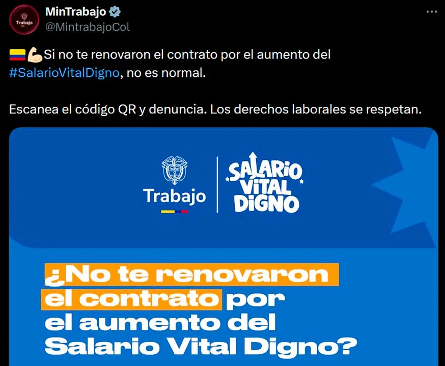 “El salario vital y familiar lo ordena la Constitución en su artículo 53. El salario vital se saca del dato del DANE sobre el costo de la canasta mínima vital de las familias en Colombia. Cogimos el dato de la canasta familiar mínima del 2025 para no ser pobre o morir. La dividí por el promedio de trabajadores por familia, dato también del DANE, y da dos millones de pesos mensuales», explicó.