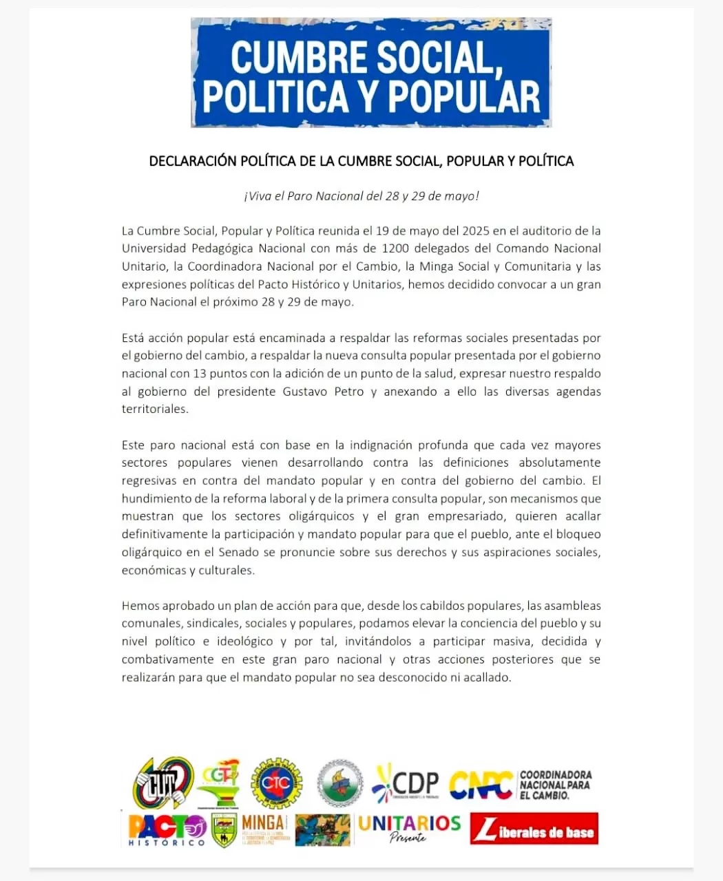 Con la participación de más de un millar de personas, la Cumbre Social, Política y Popular sesionó el pasado lunes 19 de mayo en las instalaciones de las Universidad Pedagógica Nacional, tras hacer un detallado análisis de la actual coyuntura política, determinó convocar a un Paro Nacional el miércoles 28 y el jueves 29 de mayo con el propósito de respaldar las reformas sociales y la nueva convocatoria de la Consulta Popular por parte del Gobierno del presidente Gustavo Petro.