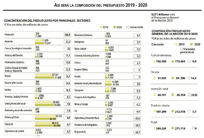 De todos los sectores que hacen parte del PGN hay que señalar que 7 de ellos tienen caídas, la más estrepitosa de las cuales (entre los sectores económicos que pueden mover la economía y generar empleo) es el agro, que se reduce en un 21,6% al pasar de 2,2 billones en 2019 a 1,8 billones en 2020.