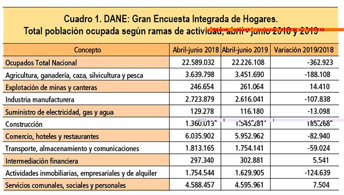 El desastre social y económico generado por este repunte es más agudo debido a la mayor velocidad con que se destruyen puestos de trabajo en comparación con los nuevos que se crean. Durante el último año, en cifras netas, se perdieron 363.000. Los Acuerdos de Paz dieron un respiro a las actividades productivas rurales; con la intensificación de la guerra a partir de la administración Duque, a lo largo del último año se perdieron 188.108 empleos en el sector agropecuario. Por la recesión económica, la quiebra de empresas, el alza del desempleo, la caída en la demanda de consumo de los hogares, la perdida de productividad unida a los altos costos de la mano de obra y al cambio tecnológico sustitutivo de fuerza de trabajo, se destruyeron, adicionalmente, 107.838 puestos de trabajo en la industria manufacturera; 124.639 en las actividades inmobiliarias, empresariales y de alquiler; 82.940 en comercio, hoteles y restaurantes; 59.024 en transporte, almacenamiento y comunicaciones; y, 13.098 en suministro de electricidad, gas y agua. Las únicas ramas de actividad económica que generan unos pocos puestos de trabajo, caracterizados por la precariedad e inestabilidad, son la explotación de minas y canteras, la construcción, la intermediación financiera y los servicios comunales, sociales y personales (Cuadro 1).