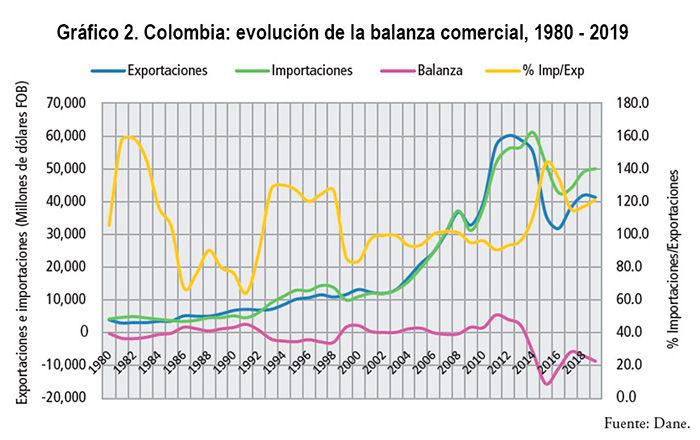 Ante esta precariedad de la estructura productiva, desmontada en sus pocos avances a lo largo de las últimas décadas, en 2019 el déficit comercial se proyecta que alcanzará un máximo histórico cercano a los USD $9.000 millones (Gráfico 2); esto es, las importaciones superarán en un 21% el valor de las exportaciones (el promedio histórico durante las cuatro últimas décadas fue de 6,3%).