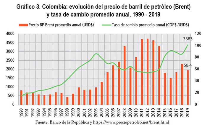 Estructura productiva y economía débil. Es así como el valor de las exportaciones del país depende mayormente de la explotación de hidrocarburos y del precio del barril de petróleo en los mercados internacionales. La tasa de cambio está atada al valor del petróleo (Gráfico 3). Debido a la destorcida del precio de los hidrocarburos a partir de 2015, el peso colombiano es la cuarta moneda más devaluada del mundo, superada solamente por el Bolívar de Venezuela, la Lira de Turquía y el Peso de Argentina, países que vienen también en picada por la vulnerabilidad de sus economías. En agosto de 2019 el peso colombiano alcanzó su máxima devaluación frente al dólar en la historia al ubicarse en $3.459, superior a los $3.434 que alcanzó en febrero de 2016. Teniendo en cuenta el abultado déficit de cuenta corriente que registra Colombia en 2019, es inevitable que cuando sube el dólar perdemos mucho más de lo que ganamos. En un sólo día, el 14 de agosto de 2019, la fragilidad de la economía colombiana quedó en evidencia frente a la turbulencia de los mercados mundiales: el índice referencial de la bolsa de valores se deslizó en -2,5%, el petróleo cayó en más de 4% y el peso colombiano continuó su devaluación en 1,2%. Ante esta realidad, la administración Duque intenta disfrazar los hechos. El Dane sigue aumentando su pérdida de credibilidad: ahora infló el crecimiento del PIB correspondiente al primer trimestre que fue de 2,8% y arbitrariamente lo subió a 3,1. Con este truco, el Gobierno anuncia que durante el primer semestre del 2019 la economía aumentó 3,05%.