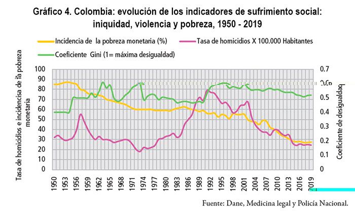 Con la tasa de desempleo subiendo, la intensificación del conflicto armado interno, la migración venezolana4 y el crecimiento económico por varios años por debajo del potencial, lo natural es que la pobreza, los homicidios y la desigualdad registren aumento. Los índices de sufrimiento de la sociedad colombiana han retornado a niveles angustiantes. En efecto, a partir de 2016, tras un período de descenso, los datos de pobreza, violencia y desigualdad volvieron a incrementarse (Gráfico 4). El nuestro es uno de los pocos países que presenta una tendencia de los homicidios al alza, mientras que, en comparación con 1990, la tasa mundial ha ido en descenso. De acuerdo con las investigaciones realizadas, se identifica que no se trata solo de una lucha de narcotraficantes o de pandillas, sino que hay muchos problemas de territorio en el país, de luchas por concentración de la tierra, la expansión del latifundio ganadero, el control de los recursos naturales y la explotación de recursos minero-energéticos; pero, además, que hay un factor cultural, y es que en el país se entiende el asesinato como una forma de solucionar problemas. Colombia, al igual que en el resto de América Latina, registra un nivel superior de 90 por ciento de impunidad; el crimen no tiene castigo, entonces se termina matando simplemente porque se puede matar y resulta más “eficaz” y “rentable”.