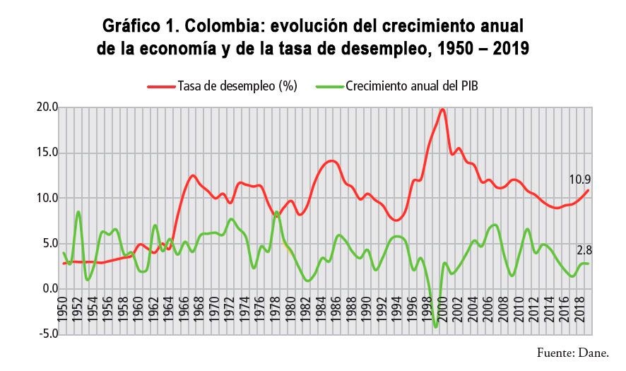 Es una caída que no pasa sin consecuencias para las mayorías que habitan esta parte de mundo, el empleo una de ellas, cuya tasa durante el último medio siglo tiende a mantenerse por encima de los dos dígitos. En el año 2000 subió al máximo histórico de 19,7%. En 2015, debido al buen ritmo del crecimiento económico, tocó piso con una tasa de 8,9%. Entre 2016 – 2019 el flagelo de la desocupación es imparable, durante 2019 retornó a la senda crónica del 11%. De acuerdo con el Dane –Gran encuesta integrada de hogares (Geih)–, durante el último año (trimestres móviles abril-junio de 2018 y 2019) el número de personas desempleadas creció en 147.000 al pasar de 2.351.000 desocupados a 2.497.000 (Gráfico 1).