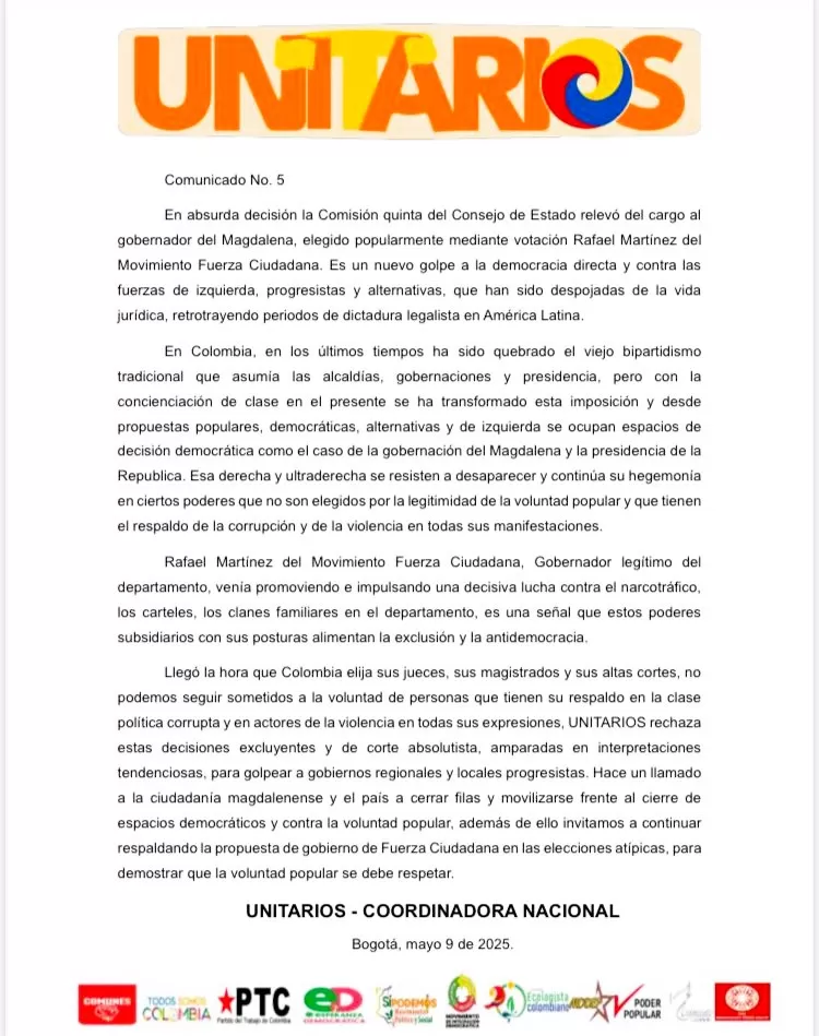 Mediante pronunciamiento público, el sector político convergente Unitarios calificó de “decisión excluyente y de corte absolutista” la anulación por parte de la Sección Quinta del Consejo de Estado, del gobernador de Santa Marta, Rafael Alejandro Martínez, del movimiento Fuerza Ciudadana.