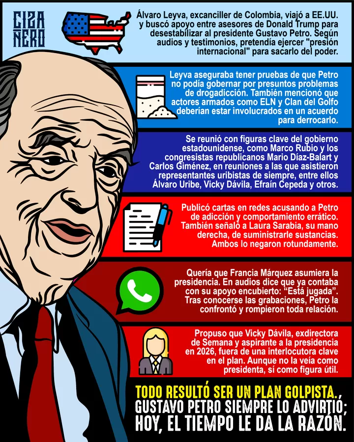 El pasado 29 de junio el diario El País de España publicó un artículo con unos audios en los que Álvaro Leyva, excanciller de Petro, se refiere a la necesidad de buscar los mecanismos para lograr que el Presidente salga de su cargo.
