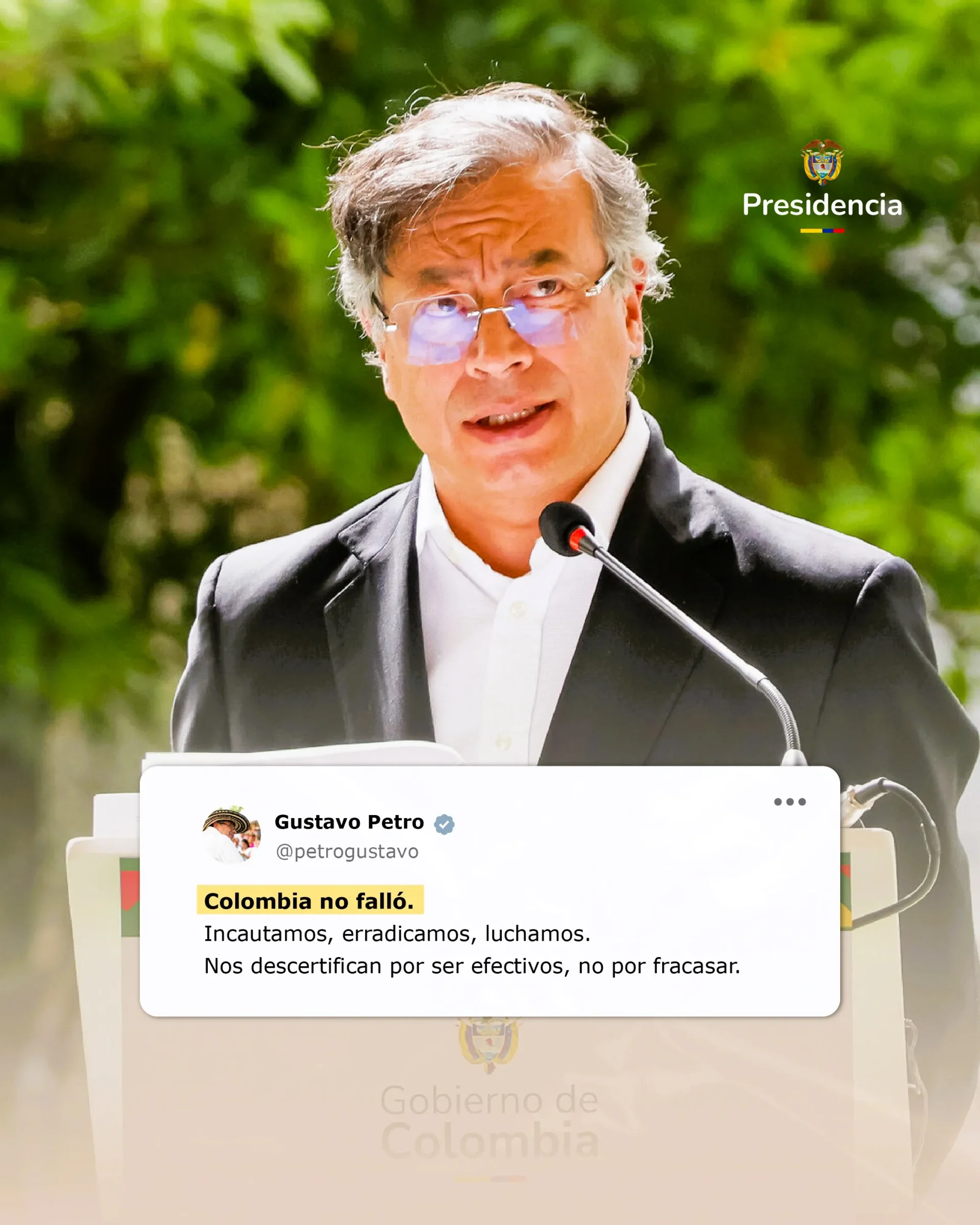 ​En su alocución, el presidente Petro se refirió al modelo de erradicación voluntaria que adelanta su Gobierno, del cual aseguró que ha dado mejores resultados que la forzosa impuesta por Estados Unidos, que lo único que generó fue el aumento de los cultivos ilícitos.