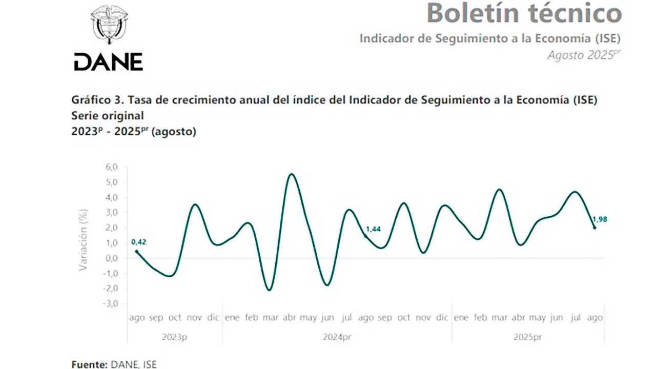 La economía colombiana registró un incremento de 1,98 % durante agosto de 2025, respecto del mismo mes del año pasado, según el Índice de Seguimiento a la Economía (ISE) para el octavo mes del año, reveló el Departamento Administrativo Nacional de Estadística (DANE).