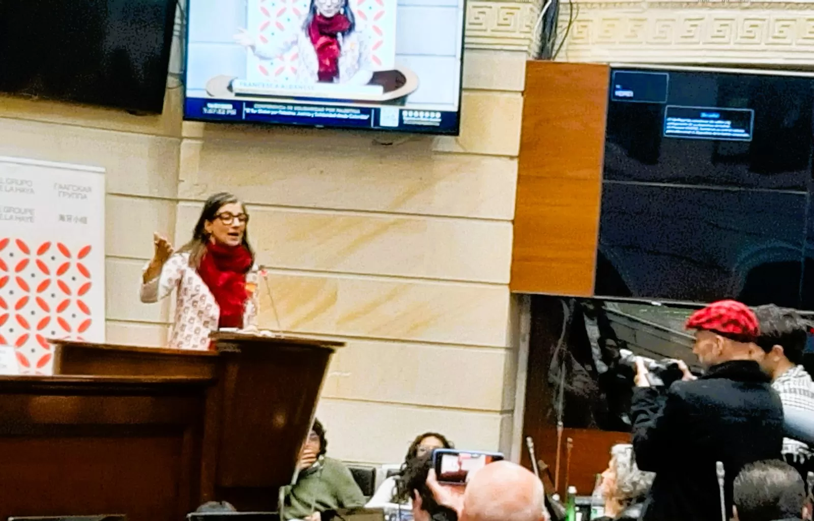 Albanese al recibir la distinción agradeció el respaldo que desde Colombia se expresa a la causa palestina, invitando a los Estados y a la sociedad civil a sumar esfuerzos en la exigencia de respeto al derecho internacional y la búsqueda de mecanismos efectivos de protección para la población civil.