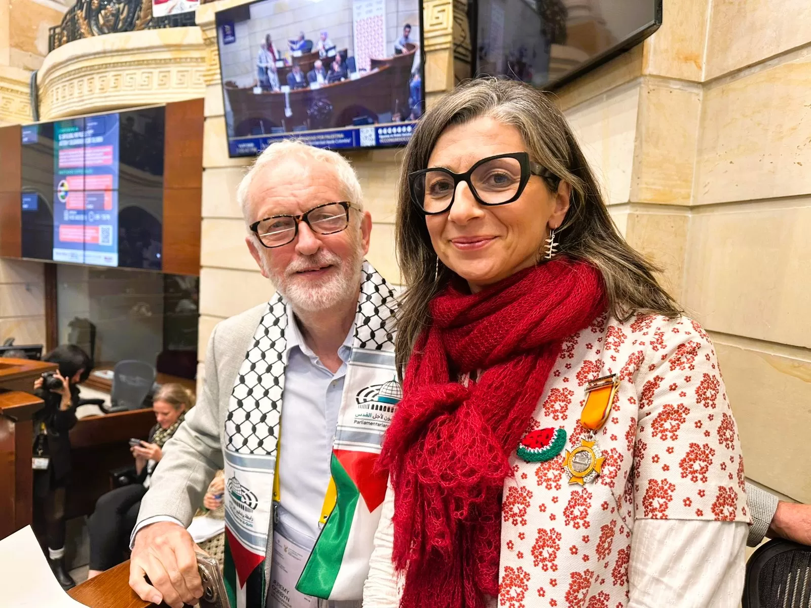 El diputado y exlíder del Partido Laboralista del Reino Unido, Jeremy Corbyn, durante su breve intervención expresó la solidaridad de amplios sectores ciudadanos británicos que acompañan la justa causa palestina y exigió justicia para los verdugos.