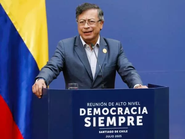 El presidente Gustavo Petro durante su intervención en el marco del encuentro "Democracia Siempre" realizado en Santiago de Chile.