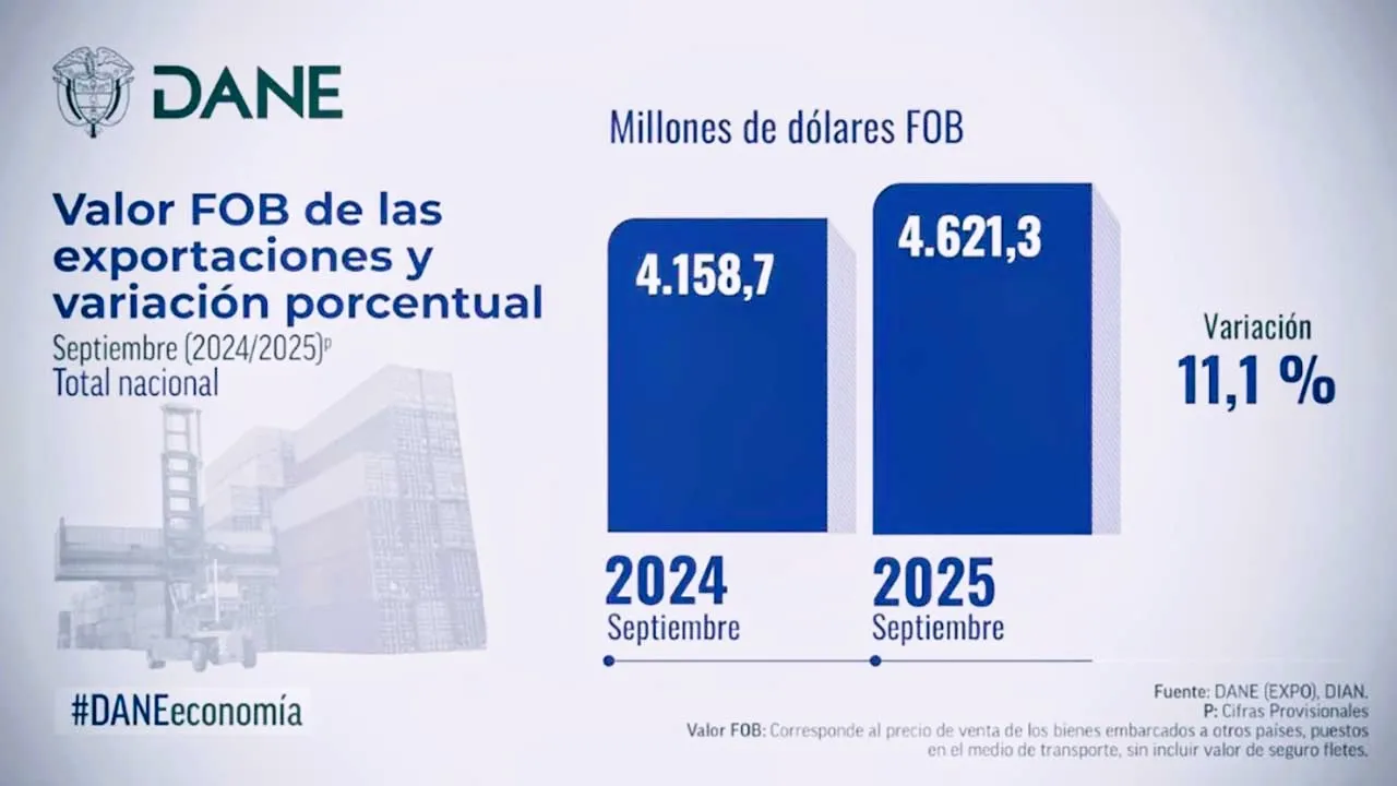 Las exportaciones colombianas durante septiembre de 2025 se incrementaron en 11,1 % con respecto al mismo mes del año pasado, al pasar de US$4.158,7 millones FOB a US$6.621,3 millones FOB, reveló el Departamento Administrativo Nacional de Estadística (Dane).