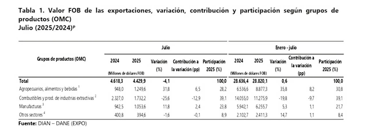 En general, durante el séptimo mes de este año, el total de las exportaciones colombianas, según los manifiestos de la Dian, fueron de US$4.429,9 millones FOB, y presentaron una caída de 4,1 % con relación a julio de 2024.