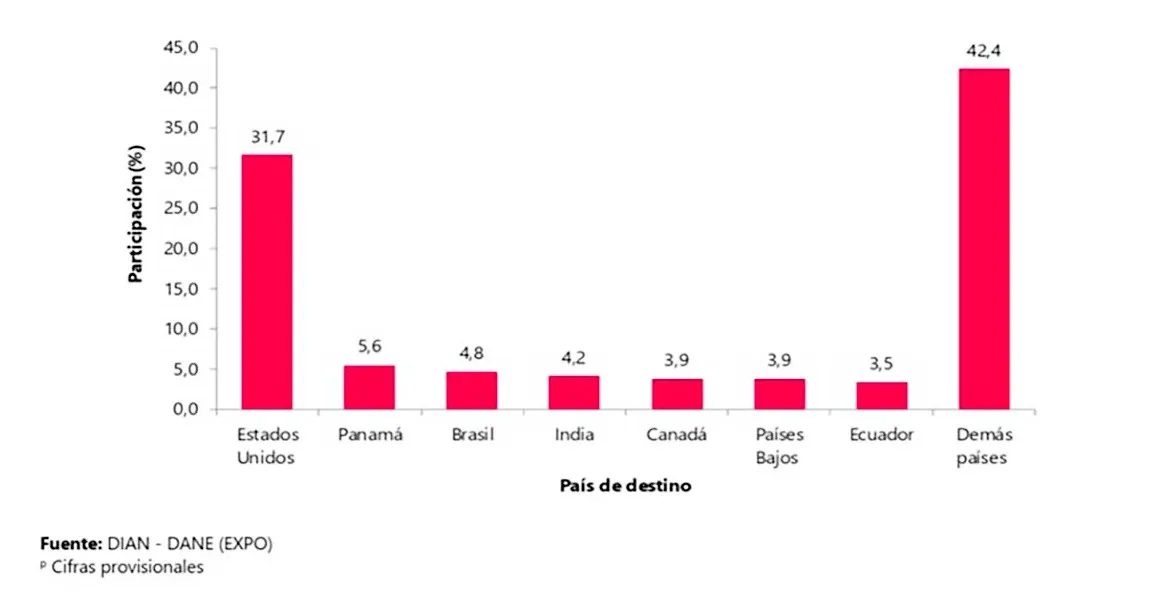 Le siguieron: Panamá (7 %), Países Bajos (4,3 %), India (3,8 %), Brasil y Ecuador (3,7 % cada uno), y China (3,2 %). Los demás países participaron con 43,7 % de las exportaciones en el periodo.