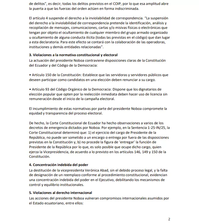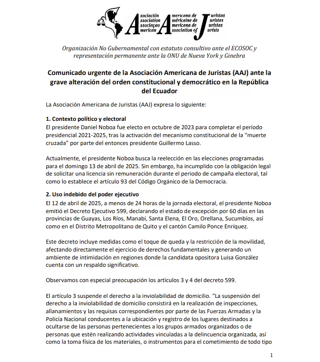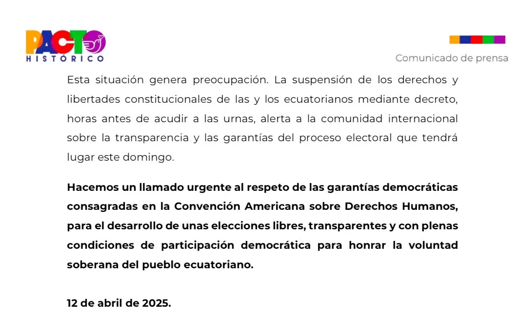 Por su parte otras organizaciones como la Asociación Americana de Juristas y la coalición política del Pacto Histórico de Colombia también se pronunciaron sobre la grave alteración del orden constitucional en Ecuador por parte del Gobierno del presidente-candidato, Daniel Noboa.