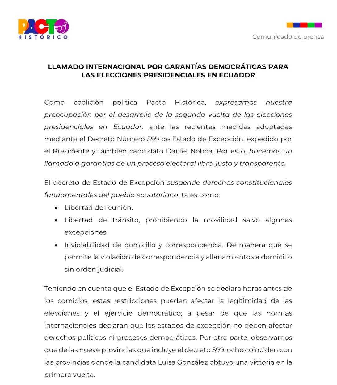 “No hay ningún hecho sobreviviente que justifique decretar un Estado de Excepción por parte del presidente Noboa quien también funge como candidato. El decreto además suspende derechos y libertades ciudadanas que hacen vulnerable la transmisión de los resultados electorales y la vigilancia ciudadana de los mismos”, sostuvo la congresista.