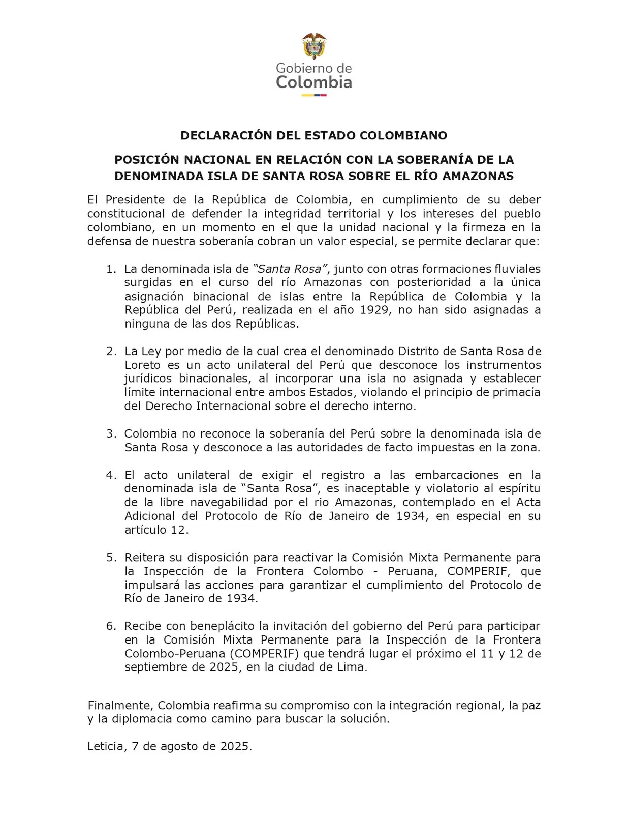A continuación, el texto de la declaración del Estado colombiano en relación con la soberanía de la Isla de Santa Rosa sobre el río Amazonas.