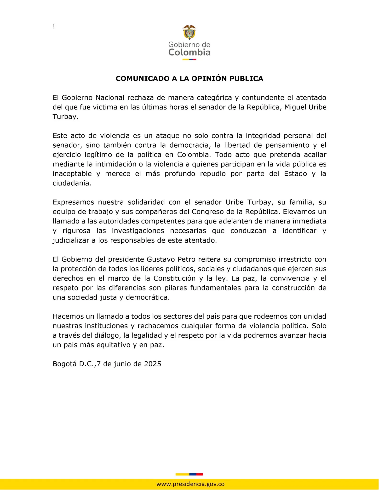 A través de un comunicado a la opinión pública, el Gobierno del presidente Gustavo Petro se pronunció sobre el atentado contra la vida del senador del Centro Democrático y precandidato Miguel Uribe Turbay.