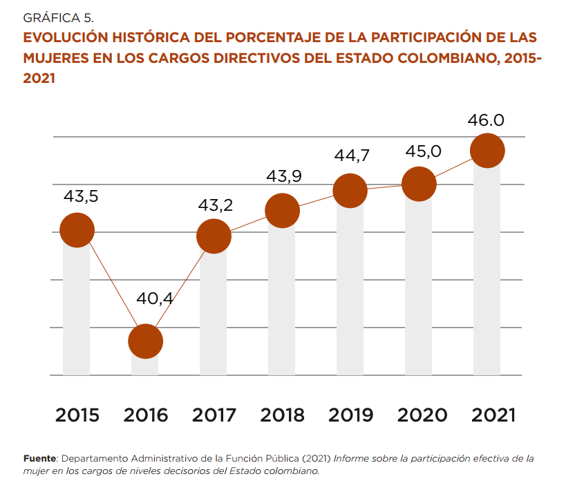 Según la Encuesta de Cultura Política del DANE para el 2021, el 75,2 % de la población consideró que la representación igualitaria entre mujeres y hombres en puestos de elección popular es una condición que debe existir en una democracia, pero en las elecciones territoriales de 2019, sólo un 12 % de mujeres fueron ungidas como alcaldesas y un 6,2 % gobernadoras. Para Congreso en el año 2022 sólo un 29,3 % de los escaños fuer para las mujeres, gracias a la lista cerrada del partido que obtuvo el mayor número de curules.