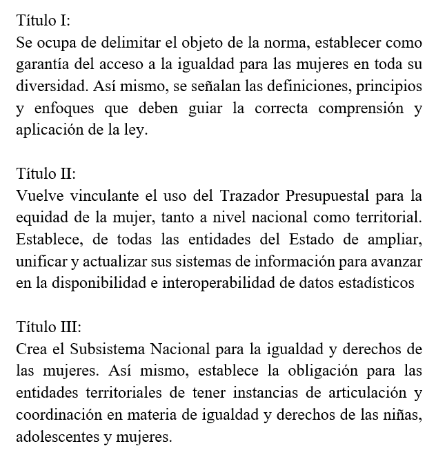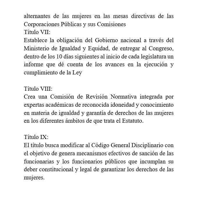 ¿Y por qué Ley estatutaria? Para regular integralmente el derecho a la igualdad de las mujeres. En el desarrollo de esta iniciativa legal se tratan los aspectos de cuidado, salud, educación, autonomía económica, participación política y social, paz y seguridad, medio ambiente y sostenibilidad, comunicaciones, tecnologías de la información e inclusión digital y prevención, atención, sanción y erradicación de las violencias que se ejercen contra ellas. Buscamos poner fin a todas las formas de discriminación contra todas las mujeres y niñas.