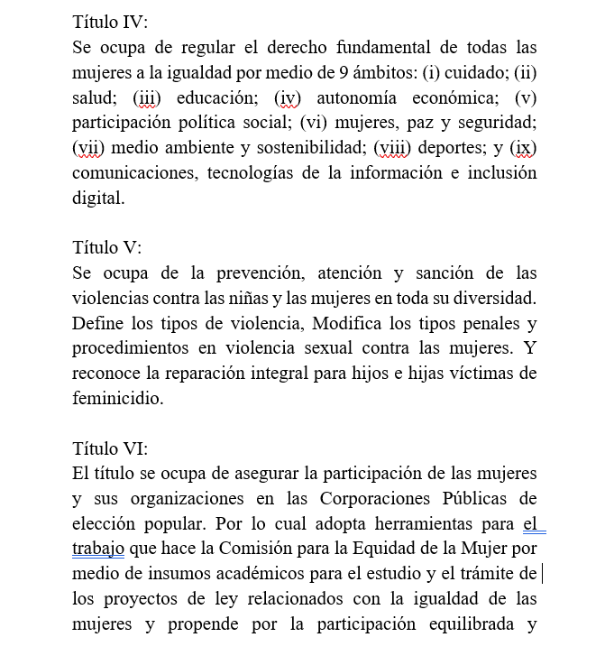 Así, este estatuto desarrolla lo dispuesto en la Constitución y hace que el Estado colombiano avance en la concreción del derecho fundamental a la igualdad para las mujeres, que continúa siendo una aspiración esquiva en múltiples ámbitos. Nombremos algunos.