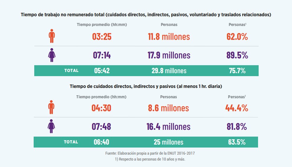 En Colombia, 19 millones de mujeres realizan trabajo doméstico no remunerado. Ello equivale en valor al 19,6 % del PIB colombiano. Además, las mujeres gastan mucho más tiempo de su día en cuidados no remunerados que los hombres.