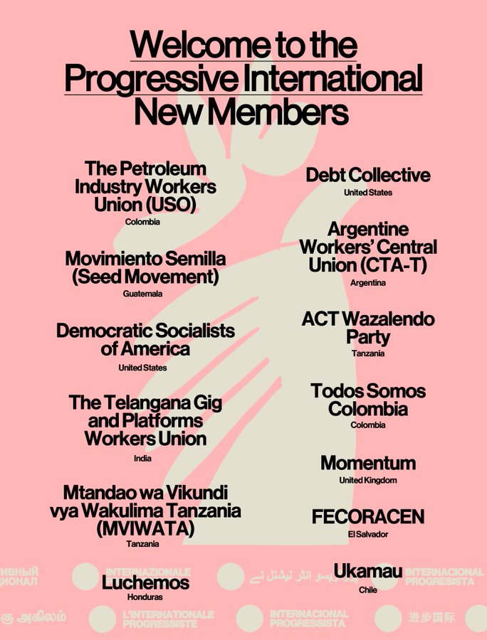 “Nuevos miembros se unen al @ProgIntl de diez países: tres sindicatos, dos organizaciones de agricultores, tres partidos políticos, un sindicato de deudores, un movimiento feminista, dos organizaciones políticas socialistas y un movimiento urbano”, informó en su cuenta de Twitter la IP.