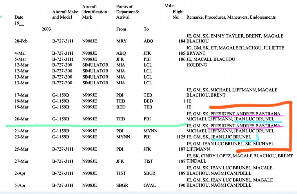 De acuerdo con los testimonios documentales, Andrés Pastrana viajó el 20 de marzo de 2003 en el conocido avión de Epstein conocido como ‘Lolita express’, G1159B, matrícula N-909JE.
