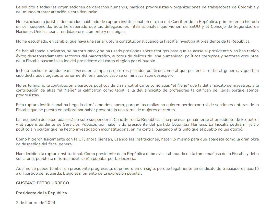 El texto del pronunciamiento público del mandatario colombiano es el siguiente: