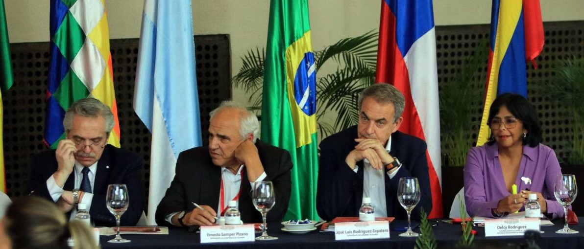 De izquierda a derecha, Alberto Fernández, Ernesto Samper, José Luis Rodríguez Zapatero, expresidentes de Argentina, Colombia y España, respectivamente. Junto a ellos la vicepresidenta de Venezuela, Delcy Rodríguez.