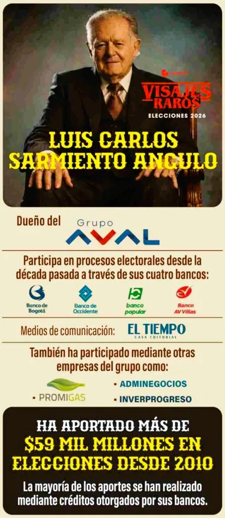 Empecemos por nombrarlos. El primero es el Grupo Aval de Luis Carlos Sarmiento Angulo. Participa en todas las elecciones desde la década pasada con sus cuatro bancos (Bogotá, Occidente, Av Villas y Popular), y con varias empresas como Promigas, dedicada al comercio de gas natural, y las comerciales Adminegocios e Inverprogreso. En total, ha aportado más de $59 mil millones en las elecciones desde 2010. La mayoría con créditos de sus bancos.