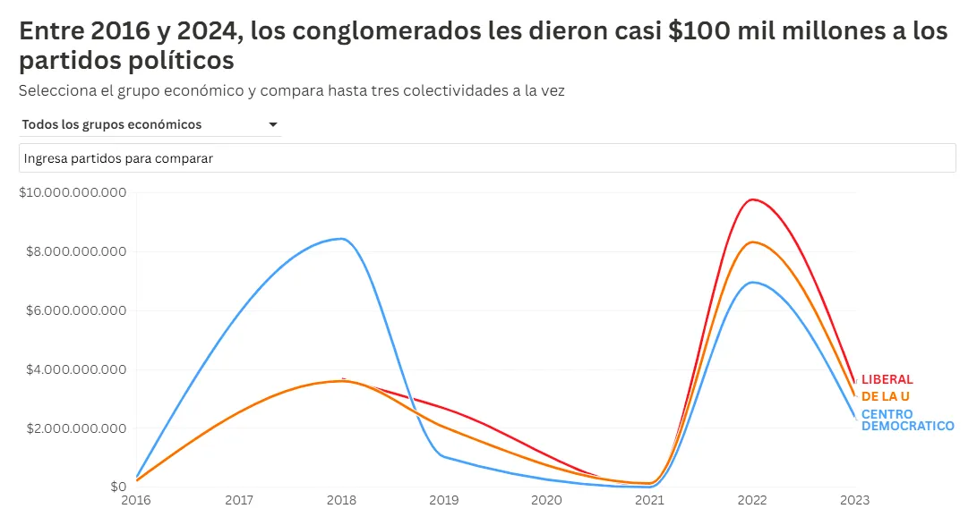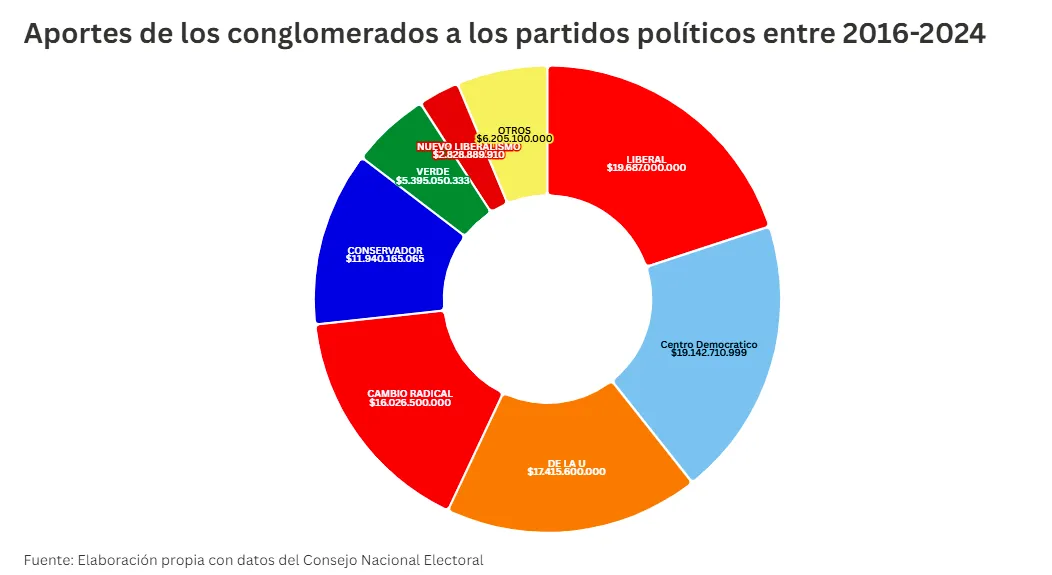 Entre 2016 y 2024, las empresas de estos seis grupos dieron casi $100 mil millones a los partidos, encabezando con el Partido Liberal, el Centro Democrático, De La U, Cambio Radical y Conservador. Solo estos cinco concentraron el 85% de los aportes que hicieron los seis grupos económicos a todos los partidos con personería jurídica.