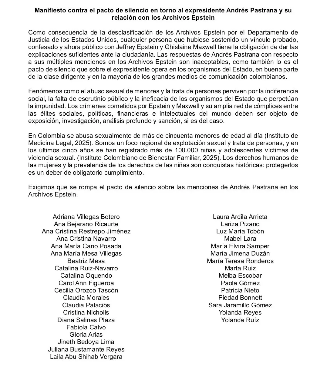 Un grupo de lideresas de opinión emitió un Manifiesto público contra el “pacto de silencio” con el que se busca minimizar la escandalosa relación del cuestionado expresidente conservador Andrés Pastrana Arango con los mundialmente conocidos archivos del pedófilo estadounidense Jeffrey Eptein, magnate al servicio del Mossad israelí, fallecido en prisión en agosto de 2019.
