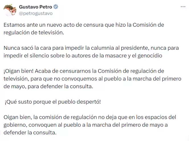 Reacción del presidente Gustavo Petro en su cuenta en la red social X sobre la censura de la Comisión de Regulaciones de Comunicaciones.
