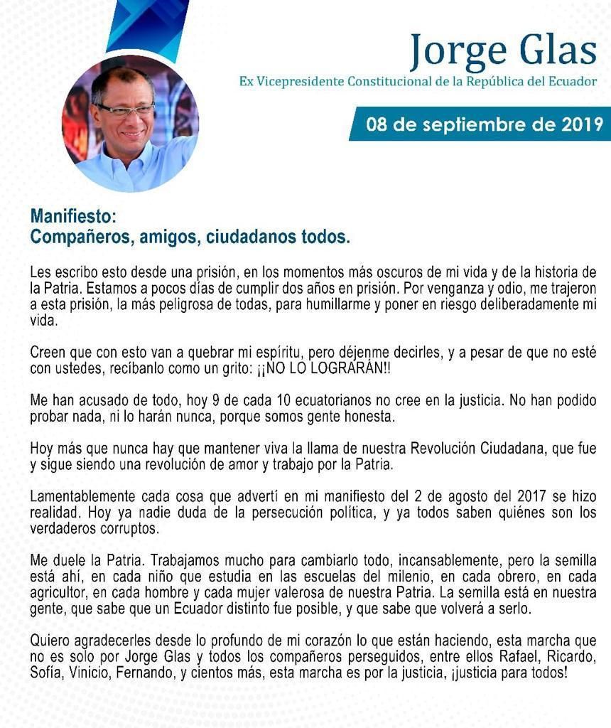 Mensaje del exvicepresidente ecuatoriano Jorge Glas desde la cárcel
