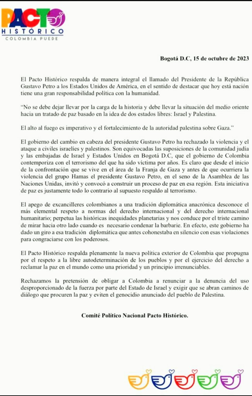 Respaldando de manera integral los pronunciamientos que en los últimos días ha hecho el presidente Gustavo Petro respecto de la crisis humanitaria que enfrenta el pueblo de Palestina, el Comité Político Nacional del Pacto Histórico emitió un pronunciamiento público expresó que rechaza “la pretensión de obligar a Colombia a renunciar a la denuncia del uso desproporcionado de la fuerza por parte del Estado de Israel y exigir que se abran caminos de diálogo que procuren la paz y eviten el genocidio anunciado del pueblo de Palestina”.