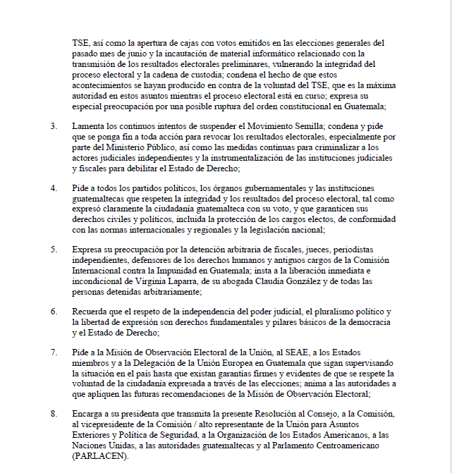 Al condenar este tipo de ardides, el Parlamento Europeo solicita “que se ponga fin a toda acción para revocar los resultados electorales, especialmente por parte del Ministerio Público, así como las medidas continuas para criminalizar a los actores judiciales independientes y la instrumentalización de las instituciones judiciales y fiscales para debilitar el Estado de Derecho”.