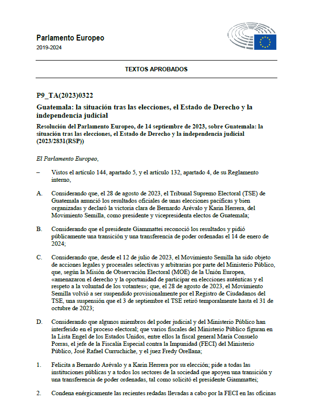 El Parlamento Europeo mediante una resolución aprobada el pasado 14 de septiembre condenó de manera categórica las maniobras que viene ejecutando el Poder Judicial de Guatemala a través de la Fiscalía General y del Ministerio Público dirigidas a desconocer el reciente triunfo en las urnas del presidente electo de esta nación centroamericana, Bernardo Arévalo de León, y de buscar anular la personería jurídica de su movimiento político Semilla.