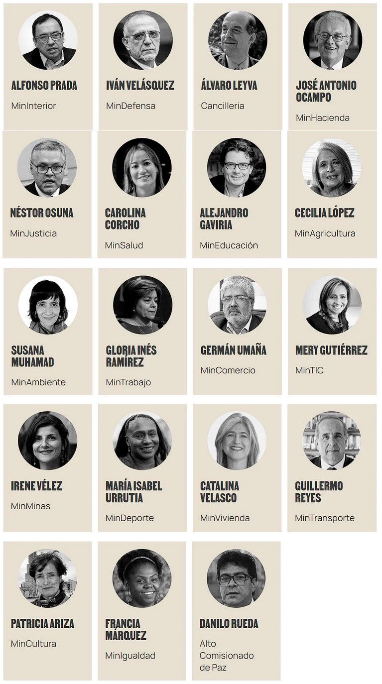 El gabinete es paritario. A pesar de que su candidatura fue impulsada principalmente por jóvenes, el promedio de edad de su equipo supera los 55 años. Casi todos son expertos en el tema de su cartera y para varios esa causa ha sido una misión de toda la vida. Siete han trabajado en el ejecutivo, cuatro de ellos como ministros en gobiernos anteriores. Solo la ministra de Ambiente trabajó en la Alcaldía de Petro como secretaria, aunque 13 de ellos son militantes de izquierda. Vienen del activismo social, la academia y la política. Del sector privado sólo la MinTic, que es dueña del canal de Youtube Tercer Canal. Aunque una bandera de Petro ha sido la defensa de la universidad pública, 14 de los 19 ministros son egresados de privadas. Más de la mitad han vivido o trabajado fuera del país.